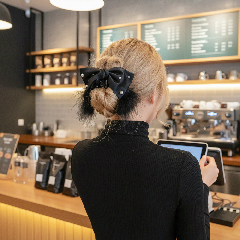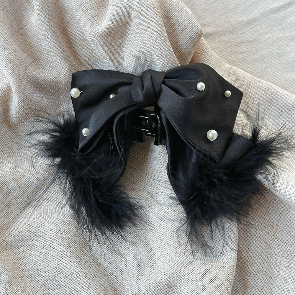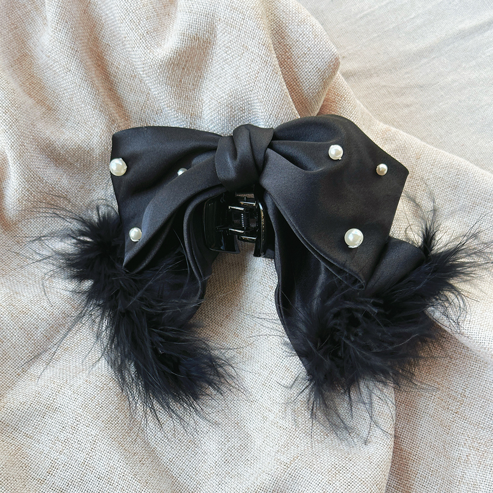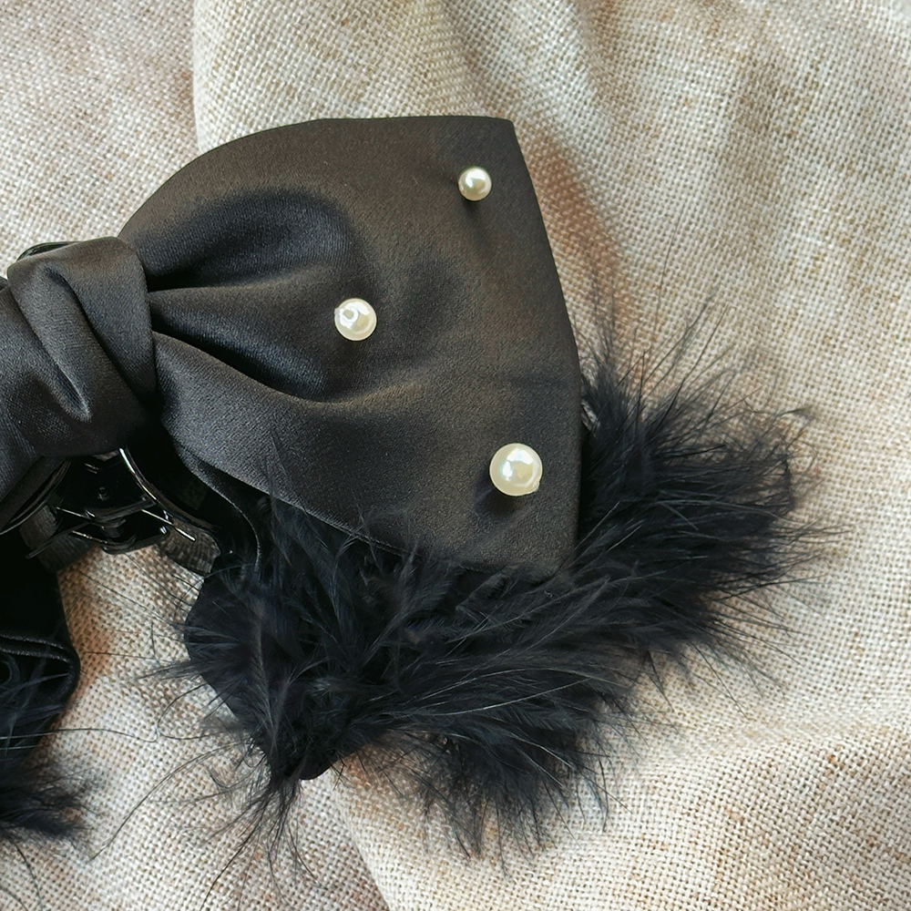 |鯊魚夾|深刻 • 毛毛珍珠蝴蝶結 布藝髮夾盤髮 單支販售